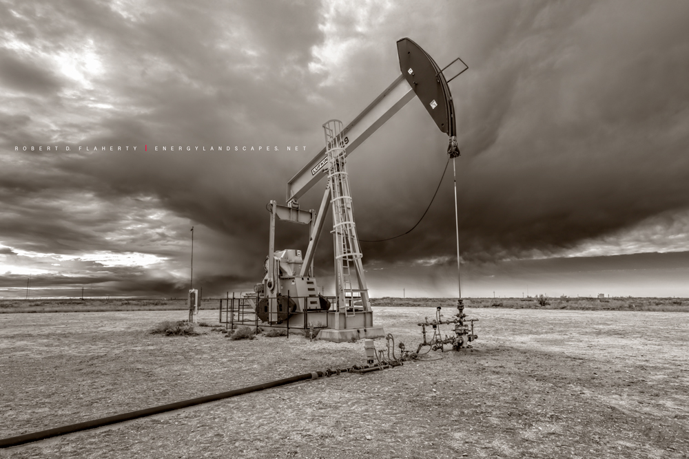 Dark Energy features an Oxy USA pumpjack pumped off before an empending winter storm on the high plains of Eastern New Mexico. The image is a high resolution fifty megapixel photograph in sepia toned black & white. A perspective control lens normally used for architectural subjects allows all points near to far to be in perfect focus. Fine Art Oil & Gas Photography By Robert D. Flaherty. Photo © copyright by Robert D. Flaherty.